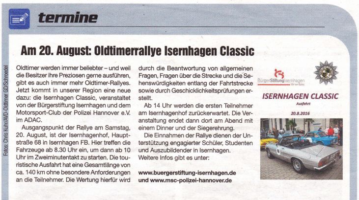 … am Sonnabend, den 20. August geht es mit der 1. Isernhagen Classic an den Start.