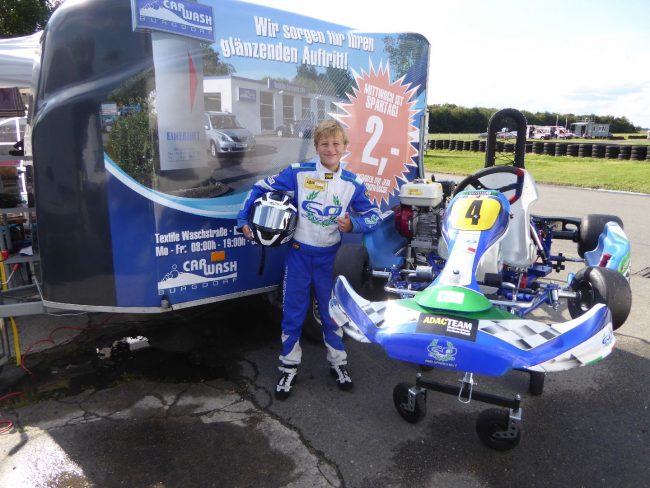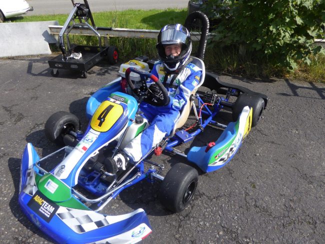 Gregor hier beim Vorstart des REC-Kart-Rennens am 2. September in Faßberg. Das Wetter meinte es in diesem Jahr nicht gut mit den Teilnehmern. Alle Rennen mußten im Regen gefahren werden. Doch Gregor konnte trotz wiedriger Bedingungen sein Können zeigen und glänzt mit einer toller Jahresbilanz. Weiteres siehe „KARTSLALOM“