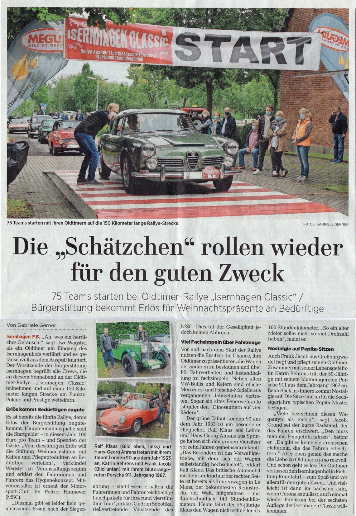 Aug.302021Isernhagen ClassicPresseErschienen in der HAZ – Ausgabe Isernhagen am 30. August 2021 30. August 2021KommentarnavigationZurückVorheriger Beitrag:… Endlich war es wieder soweit: … am 28. August starteten unsere Teilnehmer zur 5. Isernhagen Classic …NächstesNächster Beitrag:Presseartikel Hildesheim mobilÄhnliche BeiträgeNachlese zur 9. Isernhagen Classic: Gesprächsstoff bis heute1. Dezember 2025Viele Schmuckstücke bei der 9. Isernhagen Classic24. Oktober 2025Chromglänzende Klassiker auf anspruchsvoller Strecke3. Oktober 2025