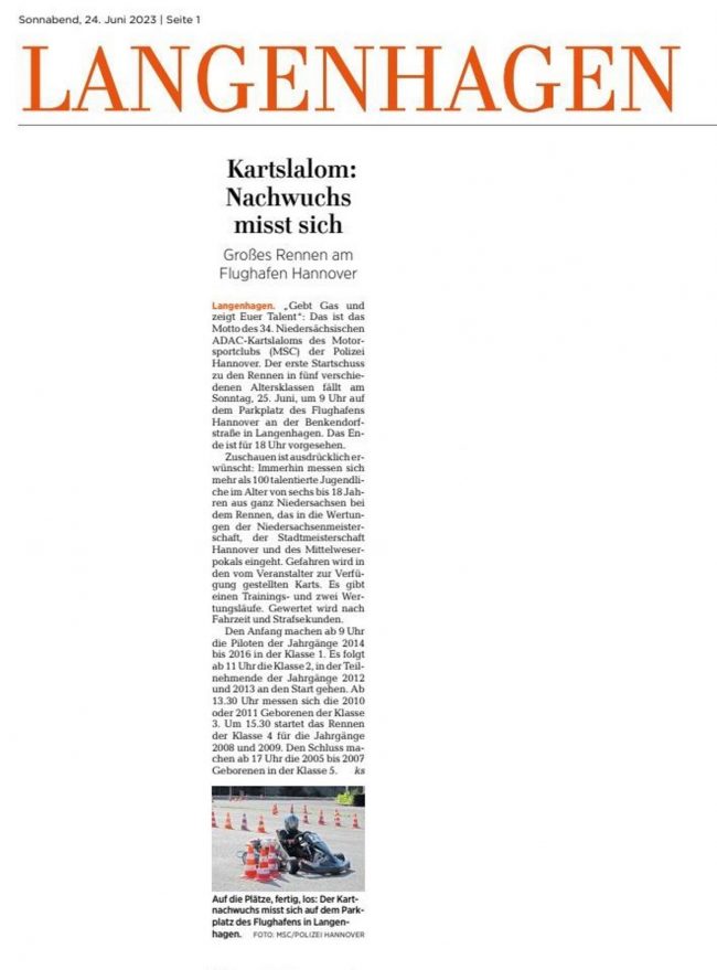 Ankündigung für unseren Kart-Slalom am 25.06.2023 Kartslalom, PresseVon Ellen Heise24. Juni 2023Dieser Artikel erschien in der HAZ / Region Langenhagen am 24.06.2023