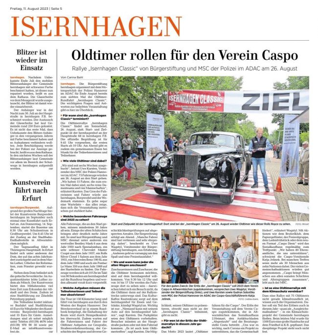 Dieser Artikel erschien am 11.8.2023 in der HAZ – OT Isernhagen Rallye „Isernhagen Classic“ von Bürgerstiftung und MSC der Polizei im ADAC am 26. August Isernhagen. Die Bürgerstiftung Isernhagen organisiert mit dem Motorsportclub der Polizei Hannover im ADAC für Ende August bereits zum siebten Mal die Oldtimer-Rundfahrt „Isernhagen Classic“. Die wichtigsten Fragen und Antworten…