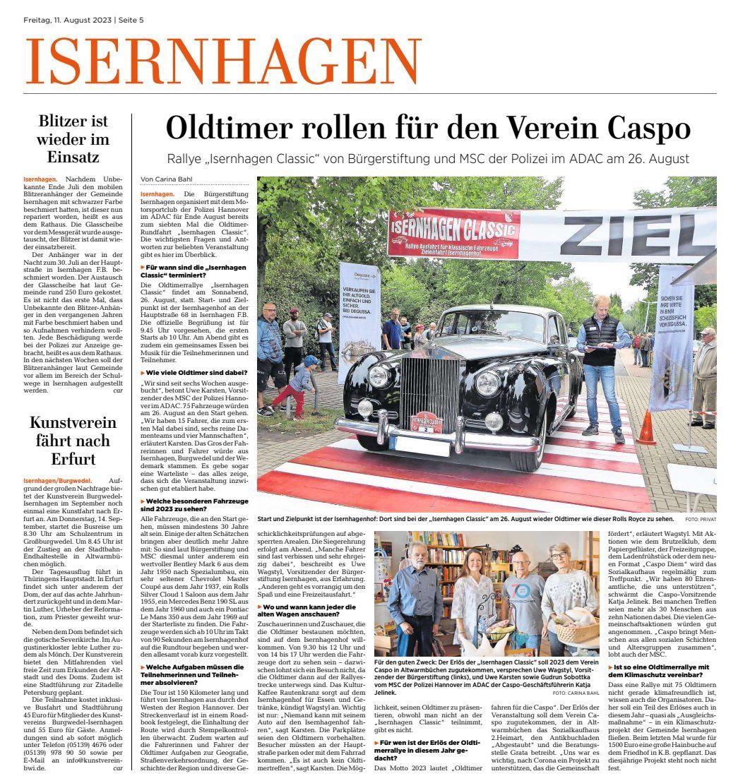 Das Motto 2023 lautet „Oldtimer fahren für die Caspo“. Der Erlös der Veranstaltung soll dem Verein Caspo zugutekommen, der in Altwarmbüchen das Sozialkaufhaus 2.Heimart, den Antikbuchladen „Abgestaubt“ und die Beratungsstelle Grata betreibt. „Uns war es wichtig, nach Corona ein Projekt zu unterstützen, das die Gemeinschaft fördert“, erläutert Wagstyl. Mit Aktionen wie dem Brutzelklub, dem Papiergeflüster, der Freizeitgruppe, dem Ladenfrühstück oder dem neuen Format „Caspo Diem“ wird das Sozialkaufhaus regelmäßig zum Treffpunkt. „Wir haben 80 Ehrenamtliche, die uns unterstützen“, schwärmt die Caspo-Vorsitzende Katja Jelinek. Bei manchen Treffen seien mehr als 30 Menschen aus zehn Nationen dabei. Die vielen Gemeinschaftsaktionen würden gut angenommen. „Caspo bringt Menschen aus allen sozialen Schichten und Altersgruppen zusammen“, lobt auch der MSC.