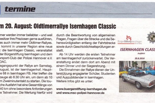 … am Sonnabend, den 20. August geht es mit der 1. Isernhagen Classic an den Start. Treffpunkt ist der Isernhagenhof.…